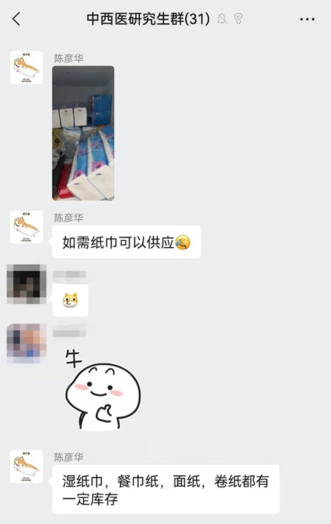 园区封闭伊始,有同学担心自己的卷纸不够,硕士班班长陈彦华同学不但将自己的卷纸分给同学,更把自己储备的各种生活用品全部拍照发在同学群中,告诉大家如有需要都可以告诉他。
